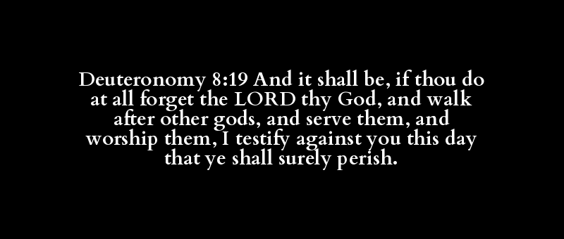 Deuteronomy 8:19 And it shall be, if thou do at all forget the LORD thy God, and walk after other gods, and serve them, and worship them, I testify against you this day that ye shall surely perish.