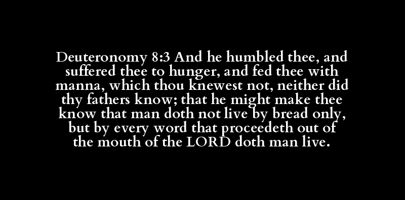 Deuteronomy 8:3 And he humbled thee, and suffered thee to hunger, and fed thee with manna, which thou knewest not, neither did thy fathers know; that he might make thee know that man doth not live by bread only, but by every word that proceedeth out of the mouth of the LORD doth man live.