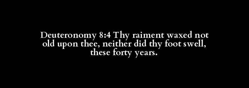 Deuteronomy 8:4 Thy raiment waxed not old upon thee, neither did thy foot swell, these forty years.