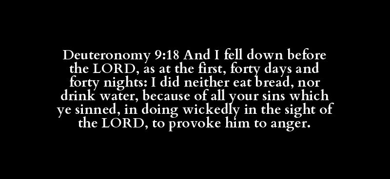 Deuteronomy 9:18 And I fell down before the LORD, as at the first, forty days and forty nights: I did neither eat bread, nor drink water, because of all your sins which ye sinned, in doing wickedly in the sight of the LORD, to provoke him to anger.