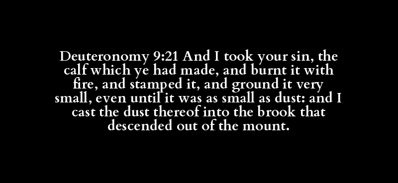 Deuteronomy 9:21 And I took your sin, the calf which ye had made, and burnt it with fire, and stamped it, and ground it very small, even until it was as small as dust: and I cast the dust thereof into the brook that descended out of the mount.