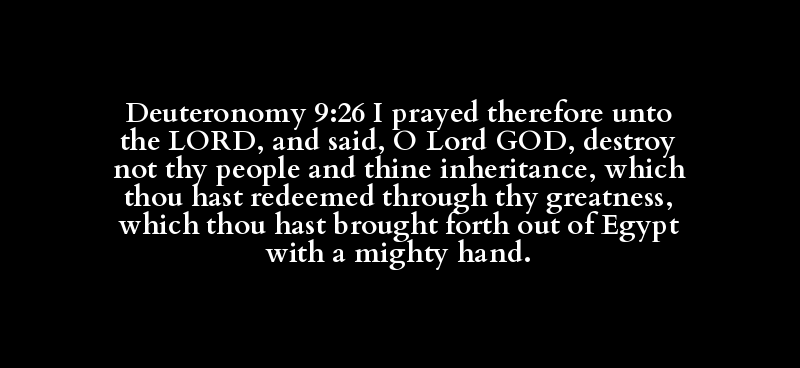 Deuteronomy 9:26 I prayed therefore unto the LORD, and said, O Lord GOD, destroy not thy people and thine inheritance, which thou hast redeemed through thy greatness, which thou hast brought forth out of Egypt with a mighty hand.