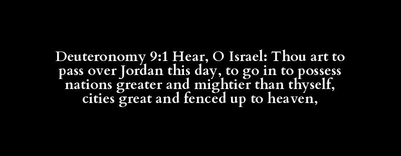 Deuteronomy 9:1 Hear, O Israel: Thou art to pass over Jordan this day, to go in to possess nations greater and mightier than thyself, cities great and fenced up to heaven,