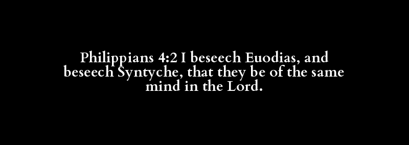 Philippians 4:2 I beseech Euodias, and beseech Syntyche, that they be of the same mind in the Lord.