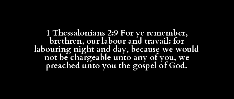 1 Thessalonians 2:9 For ye remember, brethren, our labour and travail: for labouring night and day, because we would not be chargeable unto any of you, we preached unto you the gospel of God.
