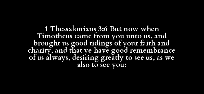 1 Thessalonians 3:6 But now when Timotheus came from you unto us, and brought us good tidings of your faith and charity, and that ye have good remembrance of us always, desiring greatly to see us, as we also to see you: