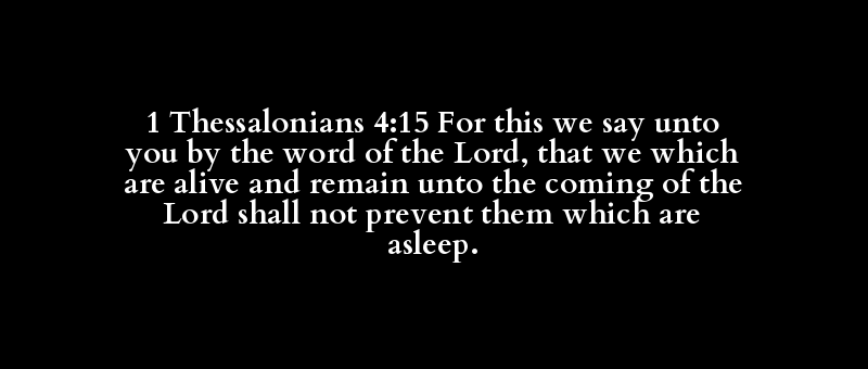 1 Thessalonians 4:15 For this we say unto you by the word of the Lord, that we which are alive and remain unto the coming of the Lord shall not prevent them which are asleep.