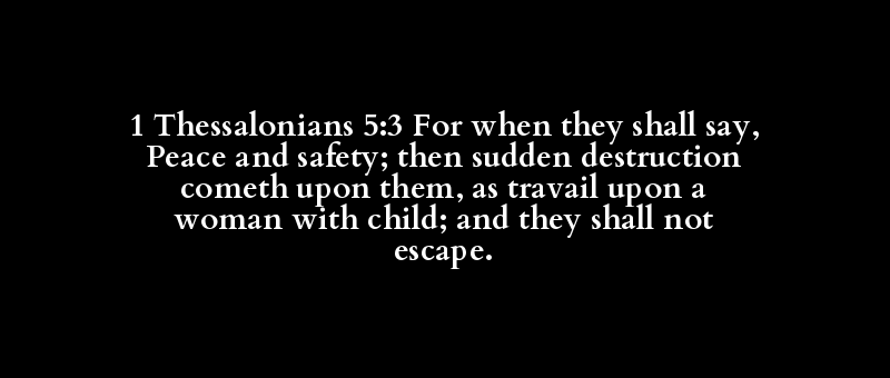 1 Thessalonians 5:3 For when they shall say, Peace and safety; then sudden destruction cometh upon them, as travail upon a woman with child; and they shall not escape.