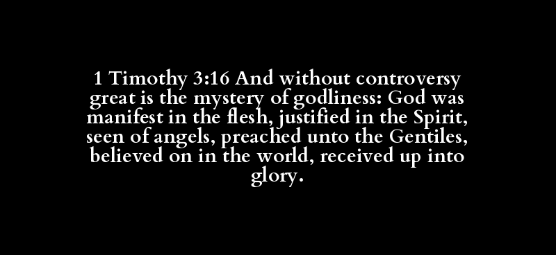 | καί | ὁμολογουμένως | μέγας | ἐστί | μυστήριον | εὐσέβεια | θεός | φανερόω | ἐν | σάρξ | δικαιόω | ἐν | πνεῦμα | ὀπτάνομαι | ἄγγελος | κηρύσσω | ἐν | ἔθνος | πιστεύω | ἐν | κόσμος | ἀναλαμβάνω | ἐν | δόξα |