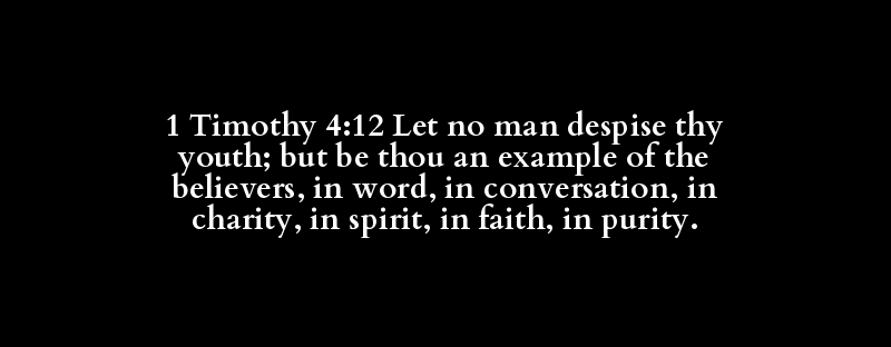 1 Timothy 4:12 Let no man despise thy youth; but be thou an example of the believers, in word, in conversation, in charity, in spirit, in faith, in purity.