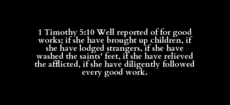 1 Timothy 5:10 Well reported of for good works; if she have brought up children, if she have lodged strangers, if she have washed the saints' feet, if she have relieved the afflicted, if she have diligently followed every good work.