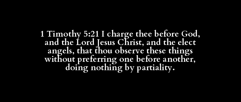 1 Timothy 5:21 I charge thee before God, and the Lord Jesus Christ, and the elect angels, that thou observe these things without preferring one before another, doing nothing by partiality.