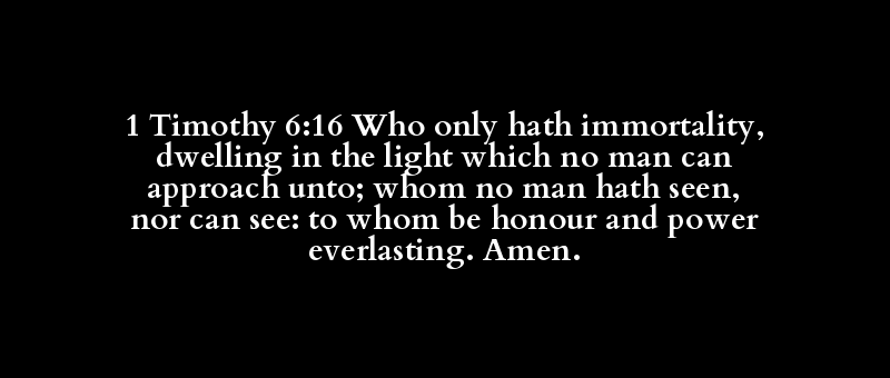 1 Timothy 6:16 Who only hath immortality, dwelling in the light which no man can approach unto; whom no man hath seen, nor can see: to whom be honour and power everlasting. Amen.