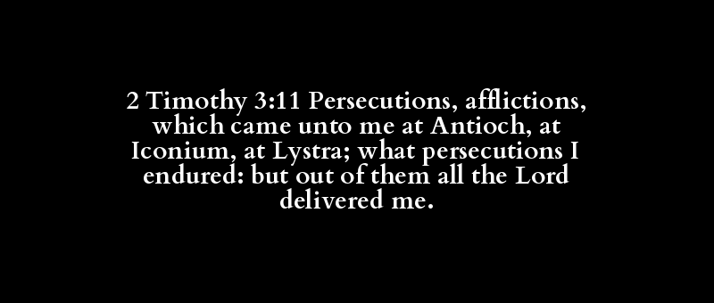 2 Timothy 3:11 Persecutions, afflictions, which came unto me at Antioch, at Iconium, at Lystra; what persecutions I endured: but out of them all the Lord delivered me.