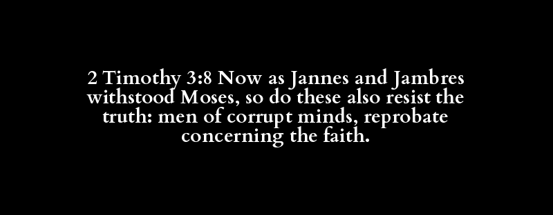 2 Timothy 3:8 Now as Jannes and Jambres withstood Moses, so do these also resist the truth: men of corrupt minds, reprobate concerning the faith.