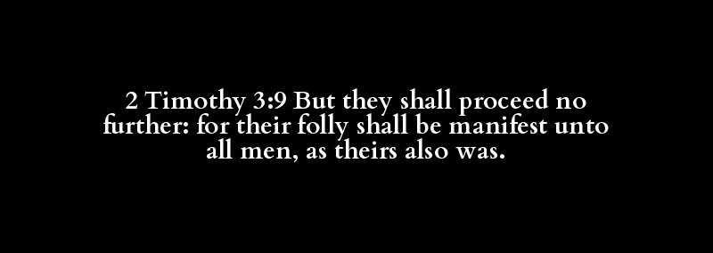 2 Timothy 3:9 But they shall proceed no further: for their folly shall be manifest unto all men, as theirs also was.