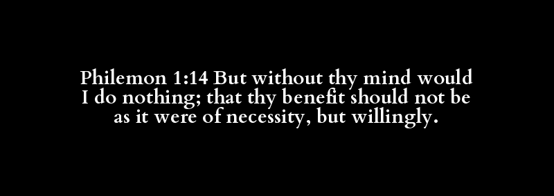 Philemon 1:14 But without thy mind would I do nothing; that thy benefit should not be as it were of necessity, but willingly.