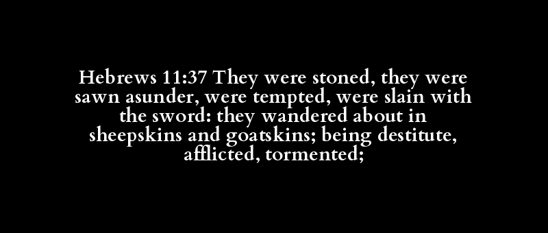 Hebrews 11:37 They were stoned, they were sawn asunder, were tempted, were slain with the sword: they wandered about in sheepskins and goatskins; being destitute, afflicted, tormented;