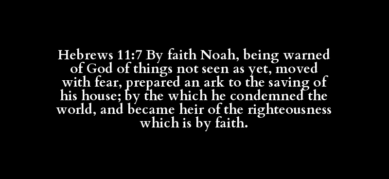 Hebrews 11:7 By faith Noah, being warned of God of things not seen as yet, moved with fear, prepared an ark to the saving of his house; by the which he condemned the world, and became heir of the righteousness which is by faith.