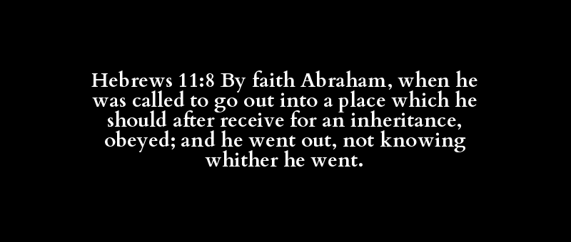 Hebrews 11:8 By faith Abraham, when he was called to go out into a place which he should after receive for an inheritance, obeyed; and he went out, not knowing whither he went.
