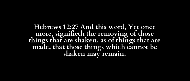 Hebrews 12:27 And this word, Yet once more, signifieth the removing of those things that are shaken, as of things that are made, that those things which cannot be shaken may remain.