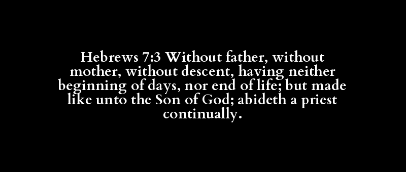 Hebrews 7:3 Without father, without mother, without descent, having neither beginning of days, nor end of life; but made like unto the Son of God; abideth a priest continually.