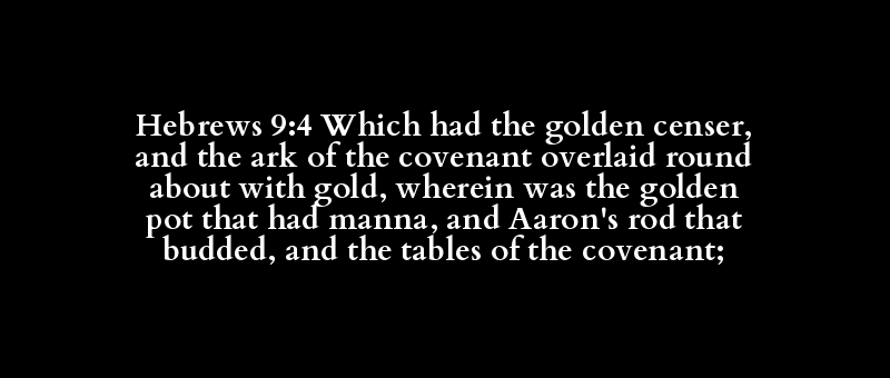 Hebrews 9:4 Which had the golden censer, and the ark of the covenant overlaid round about with gold, wherein was the golden pot that had manna, and Aaron's rod that budded, and the tables of the covenant;