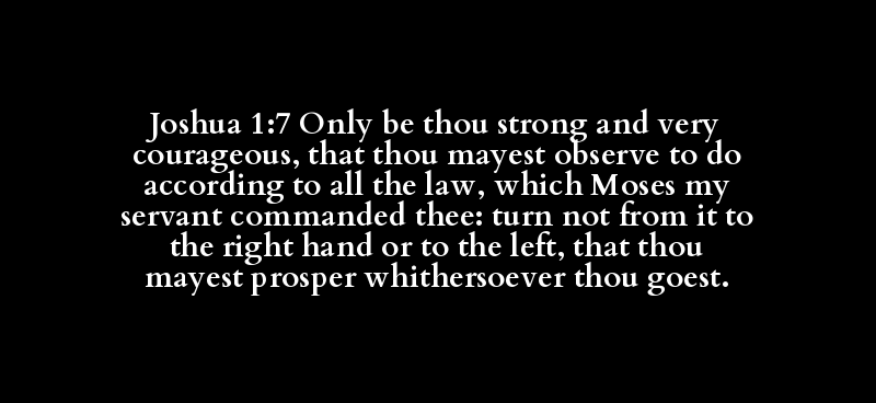 Joshua 1:7 Only be thou strong and very courageous, that thou mayest observe to do according to all the law, which Moses my servant commanded thee: turn not from it to the right hand or to the left, that thou mayest prosper whithersoever thou goest.