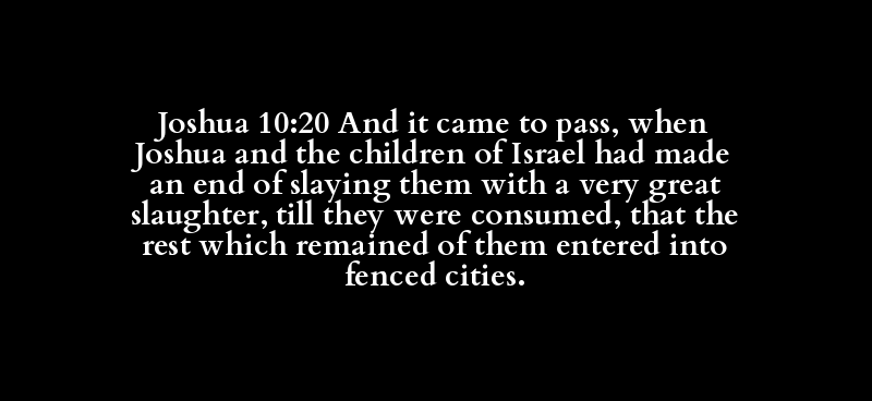 Joshua 10:20 And it came to pass, when Joshua and the children of Israel had made an end of slaying them with a very great slaughter, till they were consumed, that the rest which remained of them entered into fenced cities.