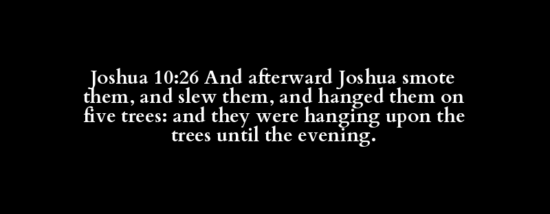 Joshua 10:26 And afterward Joshua smote them, and slew them, and hanged them on five trees: and they were hanging upon the trees until the evening.