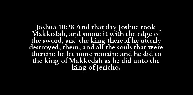 Joshua 10:28 And that day Joshua took Makkedah, and smote it with the edge of the sword, and the king thereof he utterly destroyed, them, and all the souls that were therein; he let none remain: and he did to the king of Makkedah as he did unto the king of Jericho.