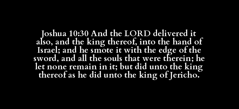 Joshua 10:30 And the LORD delivered it also, and the king thereof, into the hand of Israel; and he smote it with the edge of the sword, and all the souls that were therein; he let none remain in it; but did unto the king thereof as he did unto the king of Jericho.