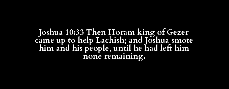 Joshua 10:33 Then Horam king of Gezer came up to help Lachish; and Joshua smote him and his people, until he had left him none remaining.