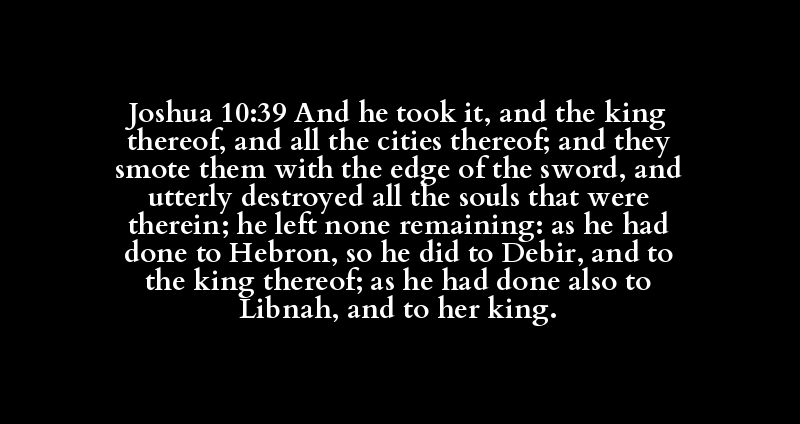 Joshua 10:39 And he took it, and the king thereof, and all the cities thereof; and they smote them with the edge of the sword, and utterly destroyed all the souls that were therein; he left none remaining: as he had done to Hebron, so he did to Debir, and to the king thereof; as he had done also to Libnah, and to her king.
