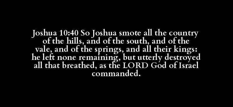 Joshua 10:40 So Joshua smote all the country of the hills, and of the south, and of the vale, and of the springs, and all their kings: he left none remaining, but utterly destroyed all that breathed, as the LORD God of Israel commanded.
