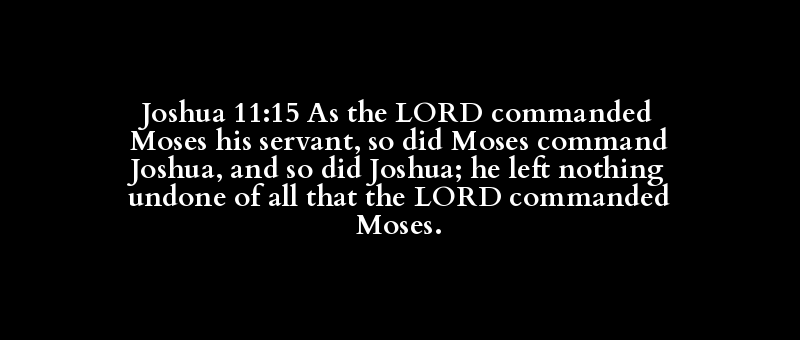 Joshua 11:15 As the LORD commanded Moses his servant, so did Moses command Joshua, and so did Joshua; he left nothing undone of all that the LORD commanded Moses.