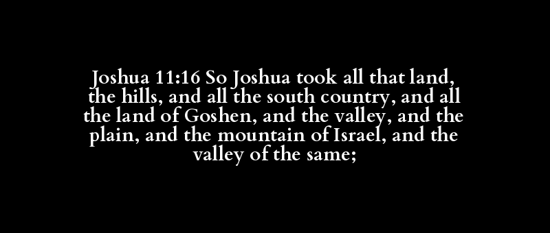 Joshua 11:16 So Joshua took all that land, the hills, and all the south country, and all the land of Goshen, and the valley, and the plain, and the mountain of Israel, and the valley of the same;