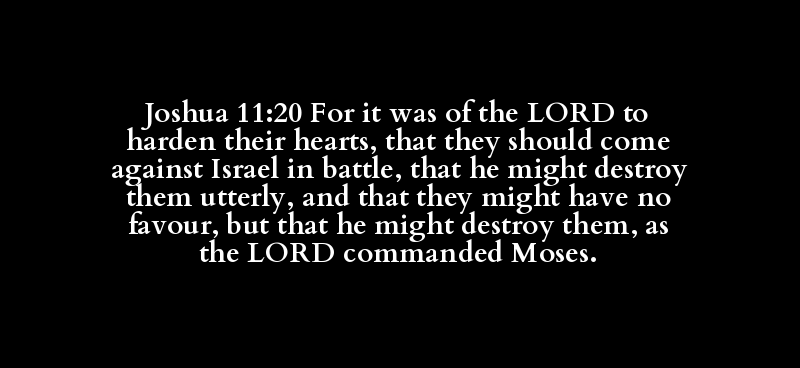 Joshua 11:20 For it was of the LORD to harden their hearts, that they should come against Israel in battle, that he might destroy them utterly, and that they might have no favour, but that he might destroy them, as the LORD commanded Moses.