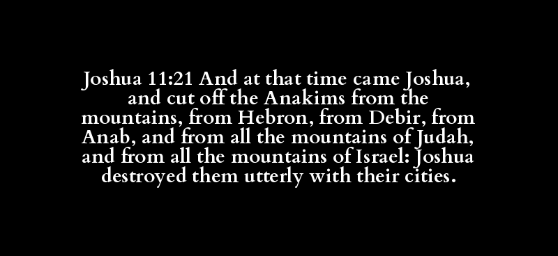 Joshua 11:21 And at that time came Joshua, and cut off the Anakims from the mountains, from Hebron, from Debir, from Anab, and from all the mountains of Judah, and from all the mountains of Israel: Joshua destroyed them utterly with their cities.