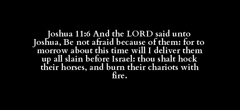 Joshua 11:6 And the LORD said unto Joshua, Be not afraid because of them: for to morrow about this time will I deliver them up all slain before Israel: thou shalt hock their horses, and burn their chariots with fire.