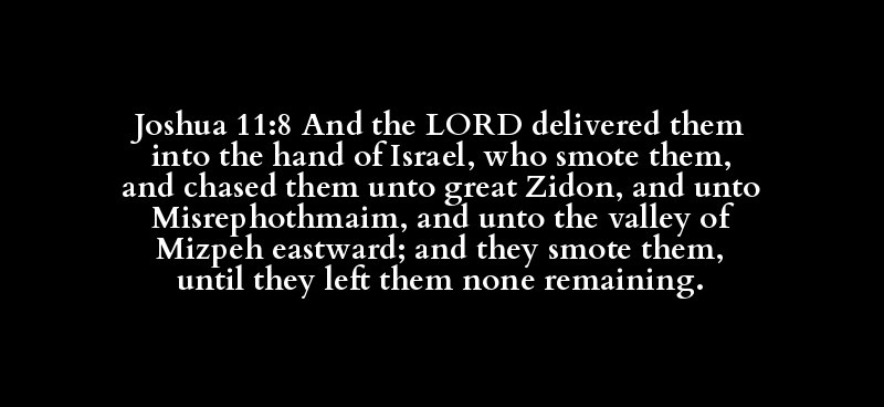 Joshua 11:8 And the LORD delivered them into the hand of Israel, who smote them, and chased them unto great Zidon, and unto Misrephothmaim, and unto the valley of Mizpeh eastward; and they smote them, until they left them none remaining.