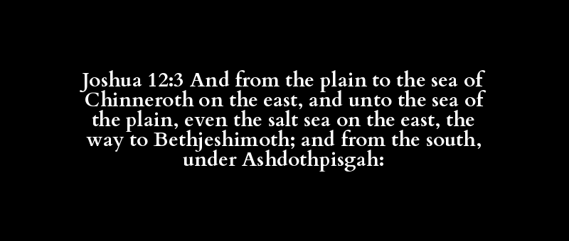 | Arabah, champaign, desert, evening, he.. | sea(-faring man, -shore), south, west(.. | Chinnereth, Chinneroth, Cinneroth | east(-ward) (side), (sun-)rising (of t.. | sea(-faring man, -shore), south, west(.. | Arabah, champaign, desert, evening, he.. | salt(-pit) | sea(-faring man, -shore), south, west(.. | east(-ward) (side), (sun-)rising (of t.. | along, away, because of, + by, convers.. | Beth-jeshimoth | south (side, -ward, wind) | Ashdoth-pisgah | springs |