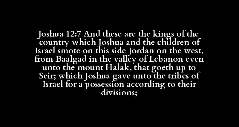 Joshua 12:7 And these are the kings of the country which Joshua and the children of Israel smote on this side Jordan on the west, from Baalgad in the valley of Lebanon even unto the mount Halak, that goeth up to Seir; which Joshua gave unto the tribes of Israel for a possession according to their divisions;