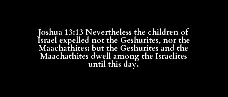 Joshua 13:13 Nevertheless the children of Israel expelled not the Geshurites, nor the Maachathites: but the Geshurites and the Maachathites dwell among the Israelites until this day.