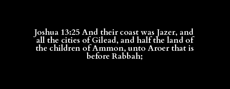 Joshua 13:25 And their coast was Jazer, and all the cities of Gilead, and half the land of the children of Ammon, unto Aroer that is before Rabbah;