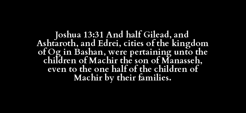 Joshua 13:31 And half Gilead, and Ashtaroth, and Edrei, cities of the kingdom of Og in Bashan, were pertaining unto the children of Machir the son of Manasseh, even to the one half of the children of Machir by their families.