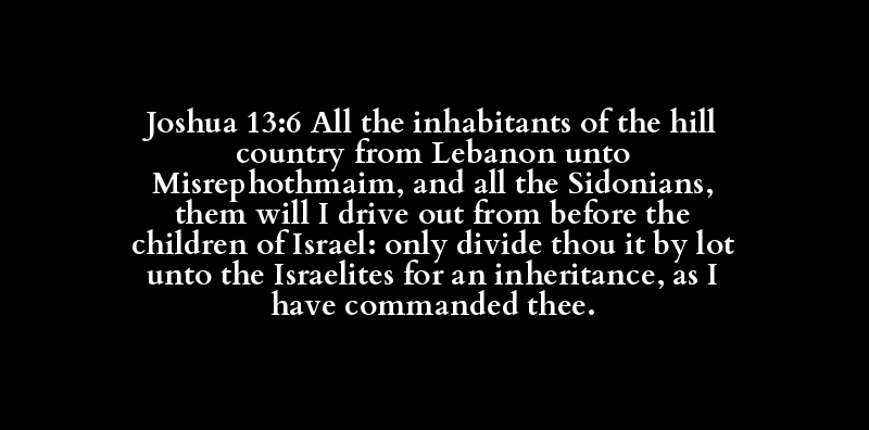 Joshua 13:6 All the inhabitants of the hill country from Lebanon unto Misrephothmaim, and all the Sidonians, them will I drive out from before the children of Israel: only divide thou it by lot unto the Israelites for an inheritance, as I have commanded thee.