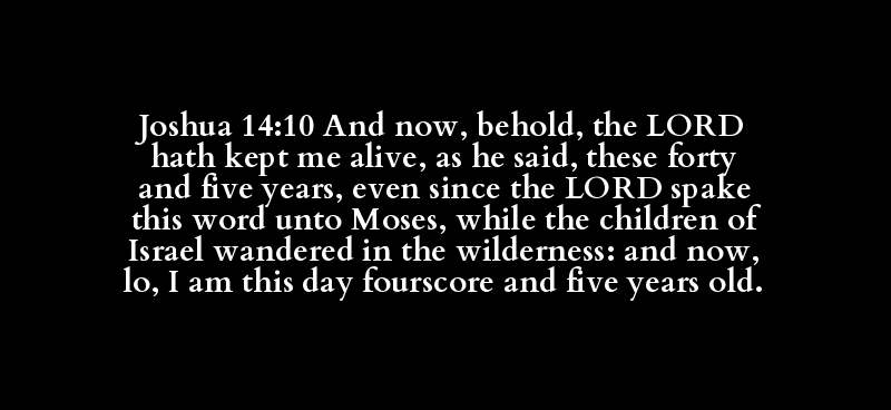 Joshua 14:10 And now, behold, the LORD hath kept me alive, as he said, these forty and five years, even since the LORD spake this word unto Moses, while the children of Israel wandered in the wilderness: and now, lo, I am this day fourscore and five years old.
