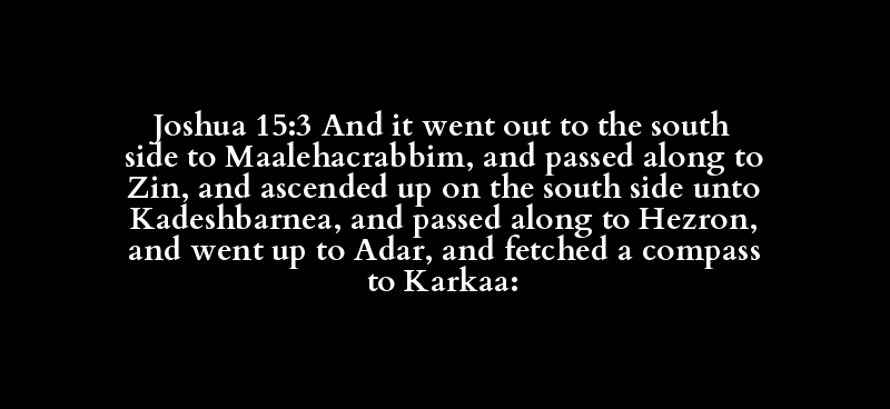 Joshua 15:3 And it went out to the south side to Maalehacrabbim, and passed along to Zin, and ascended up on the south side unto Kadeshbarnea, and passed along to Hezron, and went up to Adar, and fetched a compass to Karkaa: