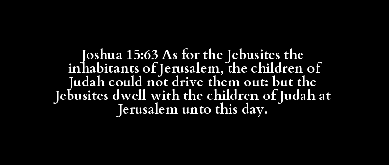 Joshua 15:63 As for the Jebusites the inhabitants of Jerusalem, the children of Judah could not drive them out: but the Jebusites dwell with the children of Judah at Jerusalem unto this day.